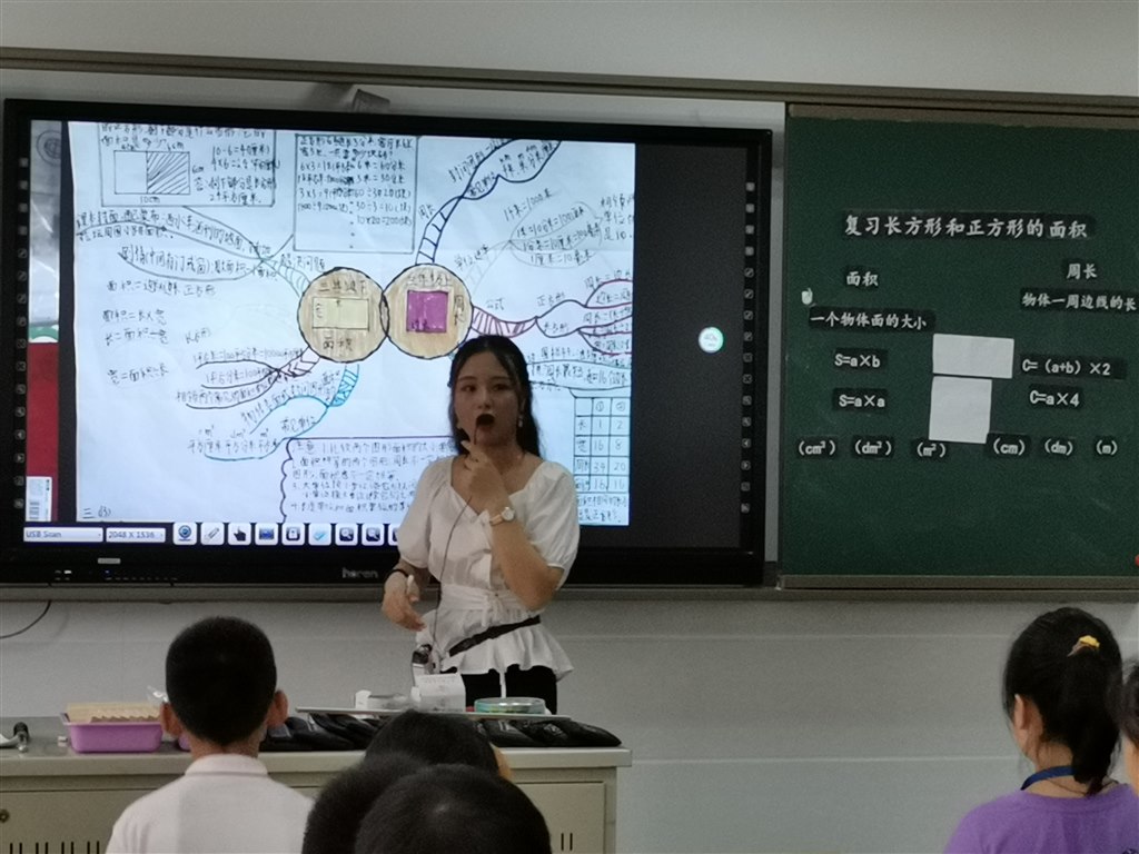 本次教研活动,首先由陈烨、何婧怡、邹琴三位老师执教示范课。在课堂教学活动中,陈烨老师带来了一节《认数复习》。她从容的教态,扎实的教学给在场的每一位老师都留下了深刻的印象。何婧怡老师准备了《长方形和正方形的面积复习》,她利用学生自己整理的思维导图,引导学生归纳了长方形和正方形面积的相关知识,并通过点评、引导学生在复习过程中抓住复习的关键。邹琴老师执教的是《方圆之间》,整节课从从研究一个圆的外切正方形和内接正方形的面积之间有怎样的关系展开,经历猜想——计算——综合、概括——结论的过程,引导学生通过合作探究的方式分析问题和解决问题。